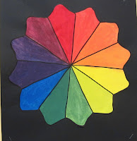 After cutting out the wedge each student traces it 12 times on a large sheet of white paper and then paint their color wheel. When the kids are done painting they need to use sharpie to go over their pencil lines, cut out their color wheel and then glue it to black paper.