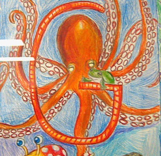 This was his artwork for the illuminated letter lesson that I posted about before. This was the first time he had a really open ended lesson from me but not the first time he had worked in colored pencil in my classroom.